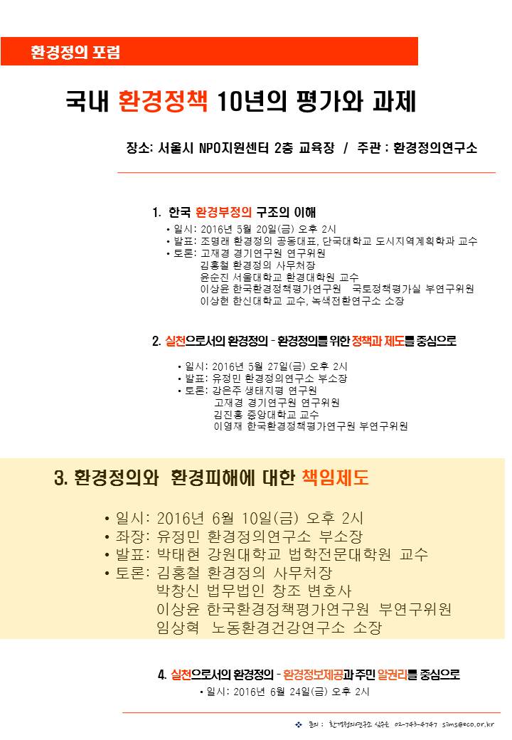 환경피해에 대하여 정부와 기업의 책임을 묻고 환경정의를 실현하기 위하여 바람직한 대안을 모색하고자 하는 자리에 많은 관심과 참여 바랍니다.